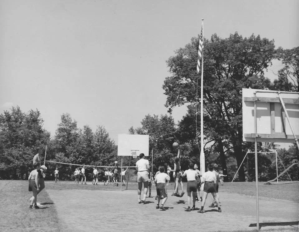 A Court--1940s intercamp game versus Camp Pontiac played in “shirts and skins”—with wood backboards, no stands for fans, and bunks that still had windows swinging open sideways from the outside only (you couldn’t open them from the inside because of attached screens).