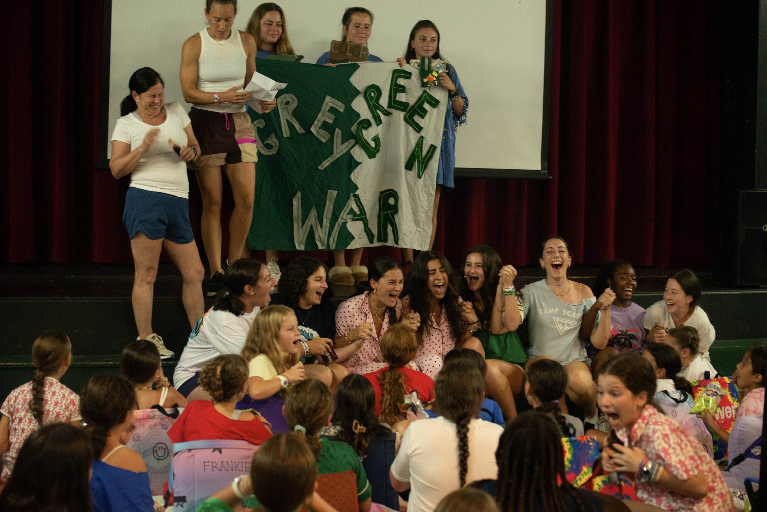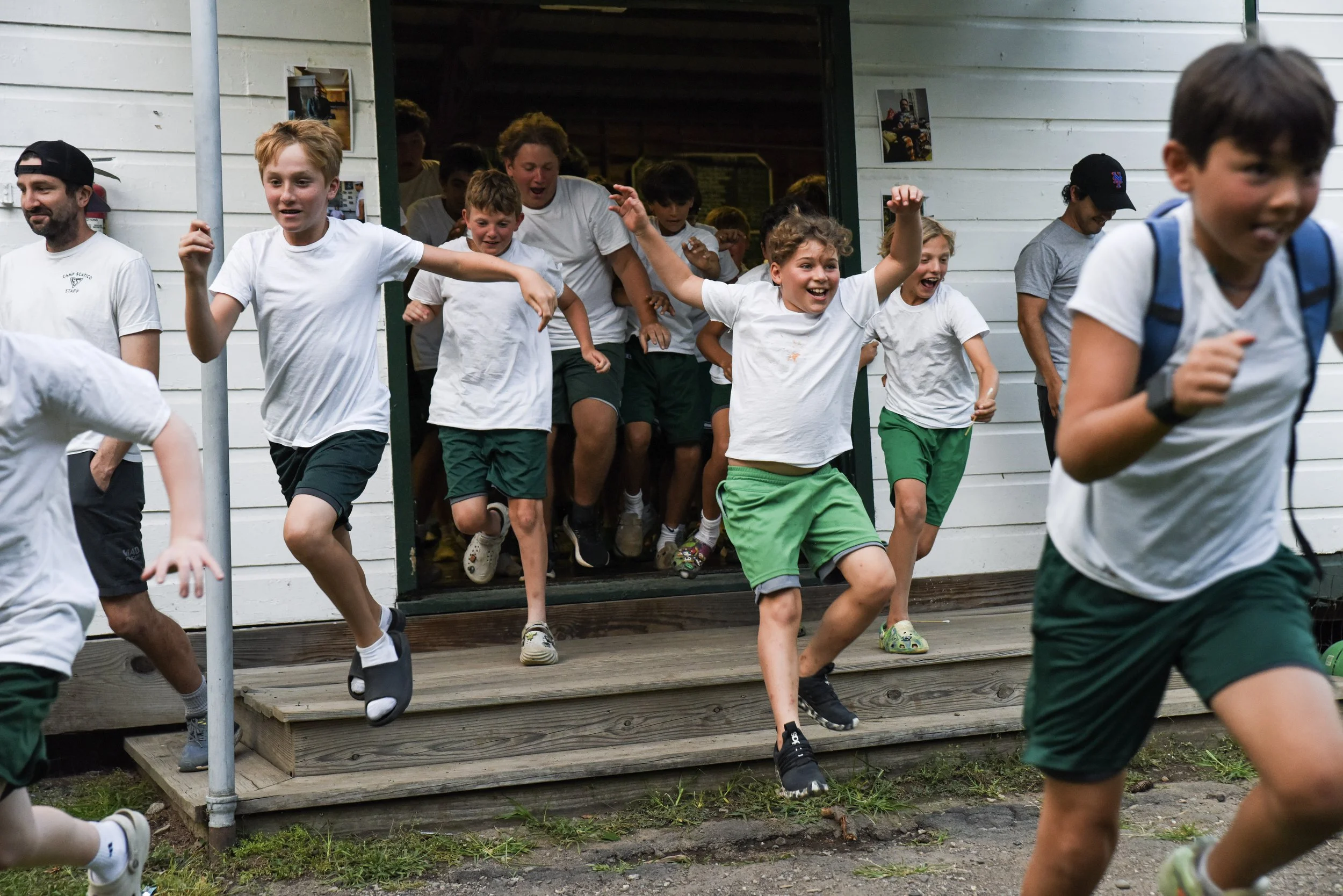 Coming soon to a camp near you....The moment Color War breaks: Left—the sprint to the A Court; Right—graduating Soopers assemble.