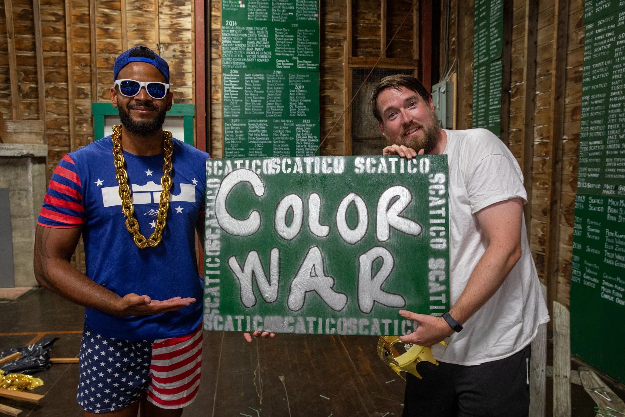 Following speeches, we watched a Quinn Croland tribute video, filled with cameos from Scatico alum, including other members of the 2006 Nat Team! Next, DLs performed a “boys sing style” song set to the tune of “Wagon Wheel,” hailing Quinn as the “Shack King.” Shoutout to Sam Ryan, for leading the DLs! Finally, Quinn’s jersey was hoisted into the rafters, and Mark got set to reveal Quinn’s plaque. For anyone paying attention, a plaque of sorts had been hiding under a gold cloth next to Mark’s podium. When Mark announced it was time to give Quinn his plaque, and he took off the cloth… underneath was a sign that said Color War!! Simultaneously, DLs rained green and grey Q-Tips down on Quinn!!