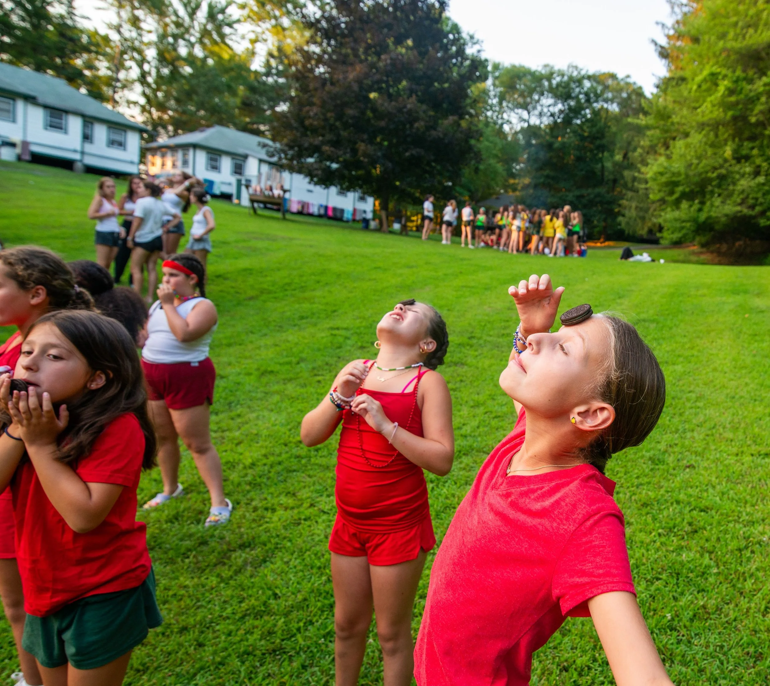 Scatapalooza is a vibrant and ever-evolving tradition at Camp Scatico and typically revolves around strengthening the bond between camp sisters. This year’s event kicked off with a wildly fun game called Organized Mass Chaos, featuring two concentric rings of counselors: the outer ring made up of Lower Hill staff and the inner ring of Upper Hill staff, guarding materials like pool noodles, shaving cream, and kickballs. Camp sisters paired up to navigate the rings, traveling from counselor to counselor collecting slips of paper with wacky tasks such as, “Tell five people you lost your compass and can’t find your way north,” or “Get two more pairs of camp sisters and form a human pyramid.” With each completed task, a counselor checked off their slip, and the goal was simple: complete as many tasks as possible before time ran out.