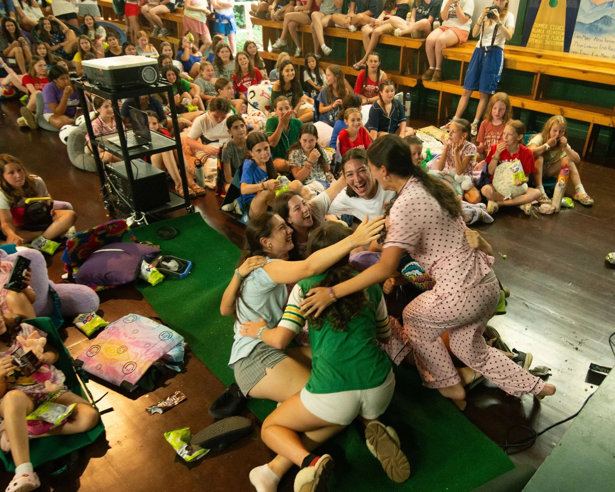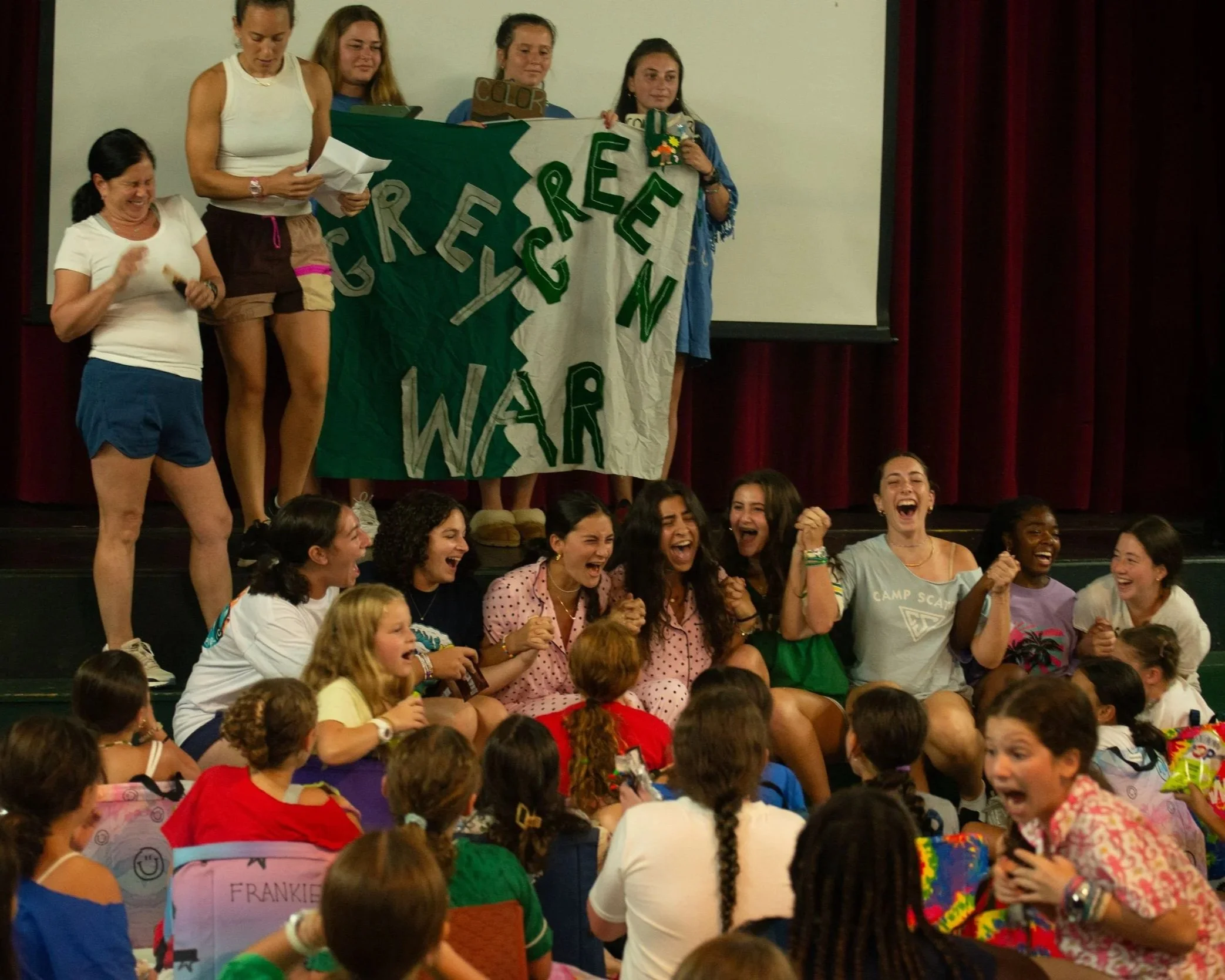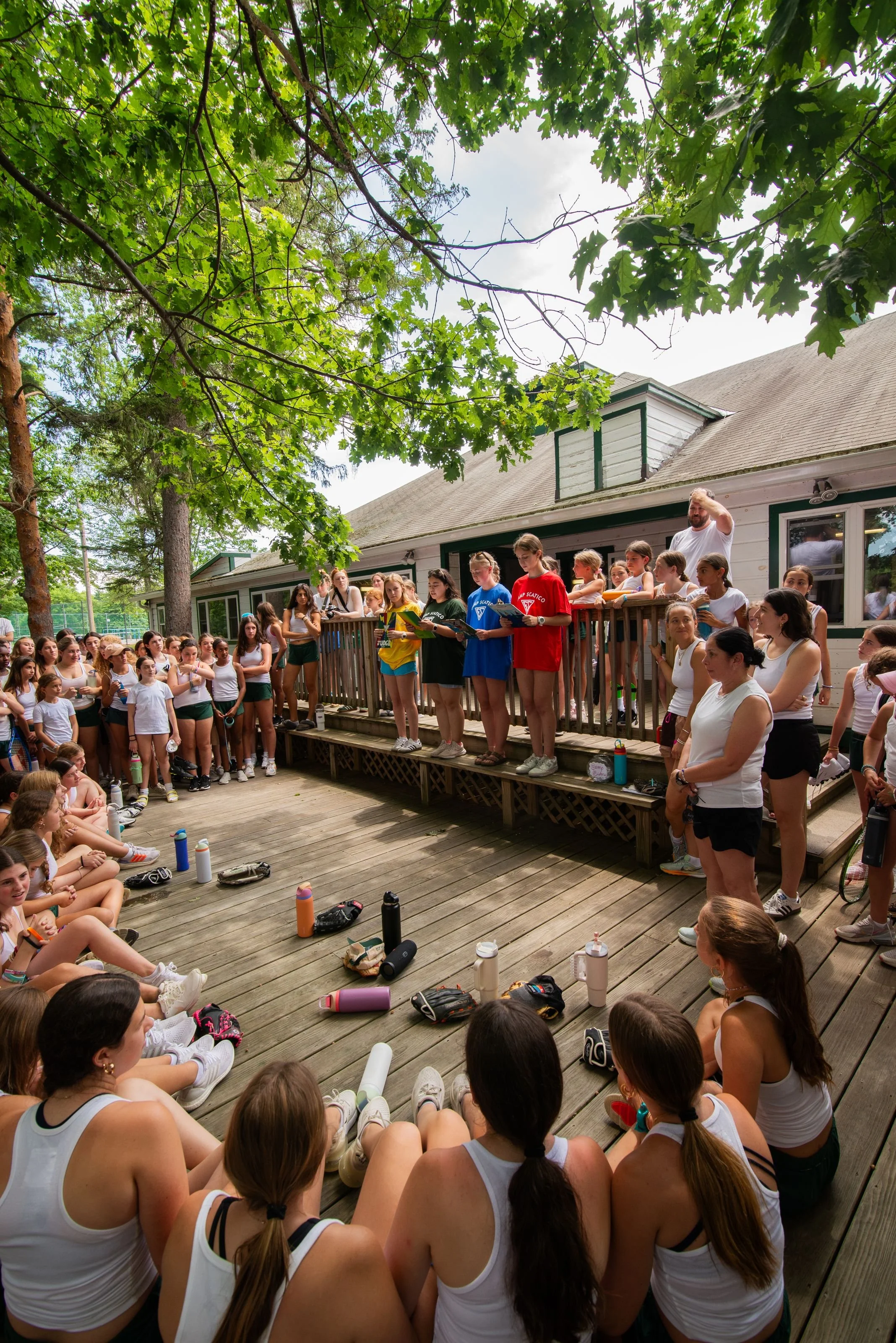 Teams– broke last Monday, when a pre-lunch dance party at “The U” (the Dining Hall porch), featured a remix of “Pink Pony Club,” in which Chappel Roan’s voice was interrupted by an alarm and “Attention Girls Side, Teams 2-0-2-5 has begun”! The Judges emerged and excitement ensued!. For Teams, the Seniors serve as leaders and girls side is split into four– Flying Eagle (green), Thunderbolt (blue), Blazing Arrow (red), and Racing Wind (yellow). You can find your camper’s team here. There will be one Teams day per week over the next three weeks in which girls compete in sports, arts, singing, and a series of “challenges”. Walking through back campus during Sunday evening Teams Meetings, girls side was a chorus of singing as campers practiced their “Jingle” (the song to be showcased at the first Teams Campfire on Tuesday).