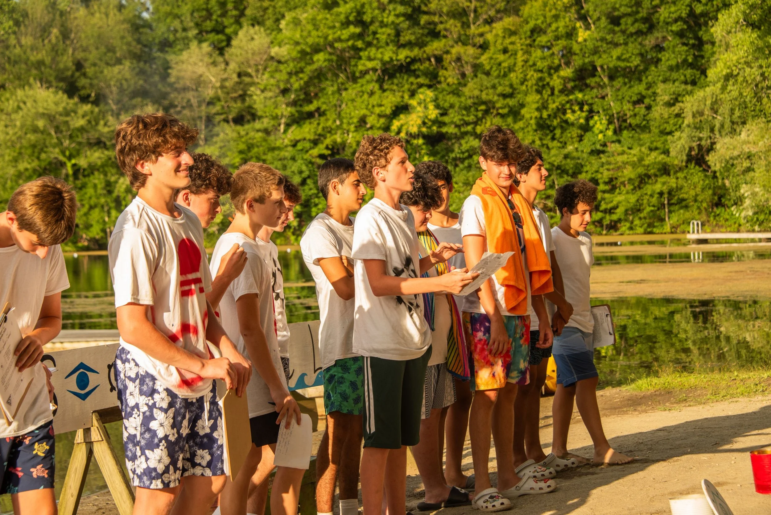 Following Friday dinner, boys side congregated at the waterfront as is tradition. As the last Friday gathering of 2025, Upper Seniors were selected to deliver the sermon: Jack Weinberg and Jonah Cooper. Jack and Jonah shared their lessons and reflections, marveling at the passage of time at camp, and how to get the most out of your summers at Scatico. At their sermon's close, they picked a rock to throw into the crib section of the lake, another final Friday ritual. Different people have different interpretations of what the “rock throw” and ensuing ripples across the water mean for them, but one interpretation is that just as one rock can create ripples that grow and spread across the entire waterfront, so can one person or one action make an impact on the entirety of camp. Each individual at camp has their role and place that contributes to the whole.