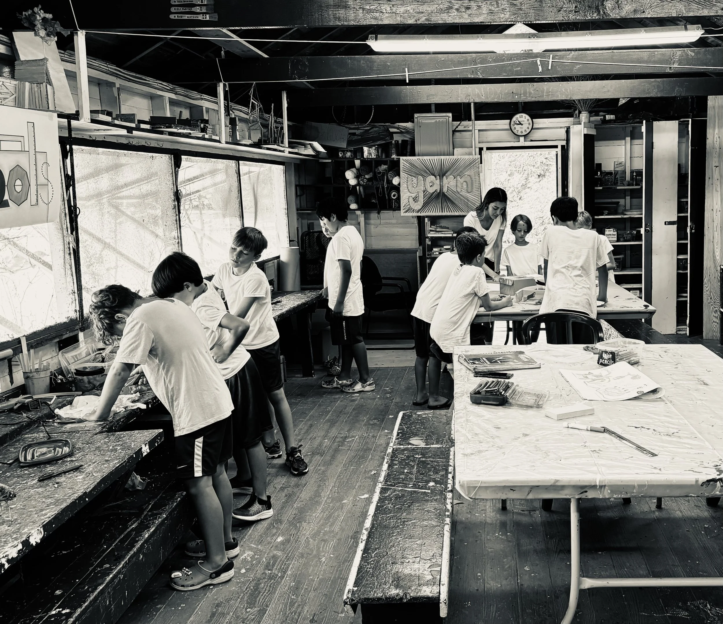The recreation from Tuesday’s first period optionals crew— a collection of lower hill campers working on Art Show projects— is pretty spot on. We have Head of Boys Art, Mar, presiding over the table in the back, and campers busy with projects along the side. Of course, there are some “spot the difference” moments: Crocs in 2024 versus ankle socks; athletic shorts instead of wool (?) ones; yarn and resin projects adorning the walls, rather than hand tools.